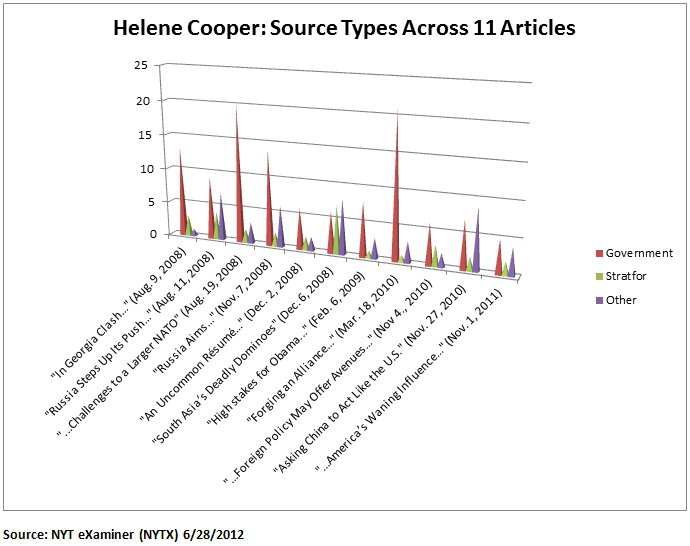 NYT eXaminer’s analysis shows that Cooper relied heavily on CEO George Friedman citing him in ten of eleven articles. On the single occasion that Cooper sourced a Stratfor analyst other than George Friedman it was because he was not available and another analyst was recommended, “Helene - we're actually in Kiev now but heading to Warsaw tomorrow. You really should talk to Rodger Baker…” (Doc-ID: 289986). Cooper agreed and interviewed Baker for her article that the Times published three days later. (“Asking China to Act Like the U.S.,” November 27, 2010, NYT) While Cooper also sourced many diplomats and government officials, they gave restrained and sometimes anonymous quotes. Reliance on Friedman allowed Cooper to publish unrestrained “forecasts” and speculation. That Cooper did not rely on any non-governmental source with as much fervor conveys her favoritism towards George Friedman and Stratfor.